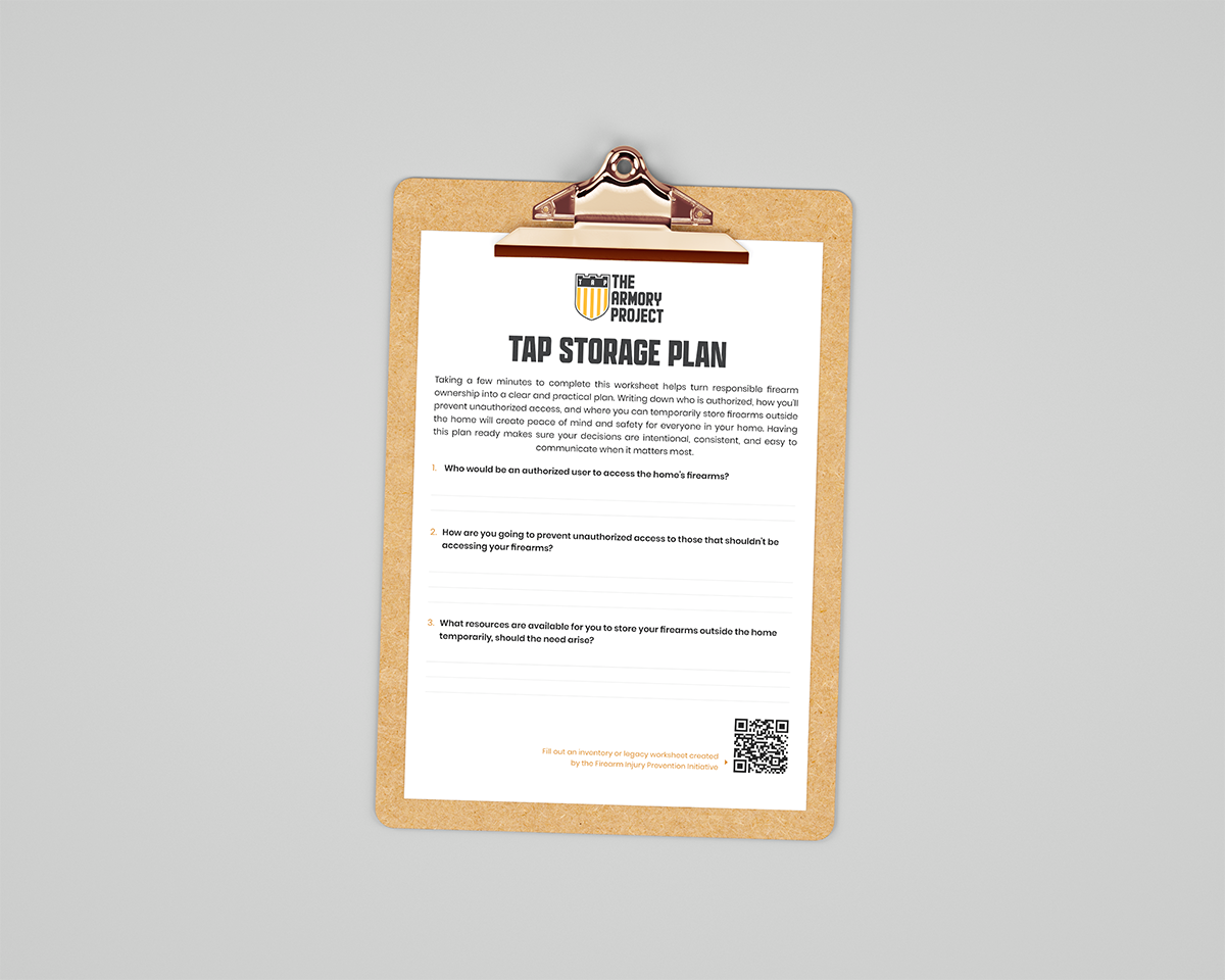 Life can change fast. A sudden decline in mental health, a relationship crisis, a job loss, or a stressful season can make clear decision-making harder than usual. The TAP Storage Plan is a quick, three-question worksheet that helps you write down who can access your firearms, how you will prevent unauthorized access, and what temporary off-site options are available if you ever need them.